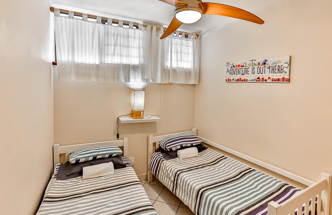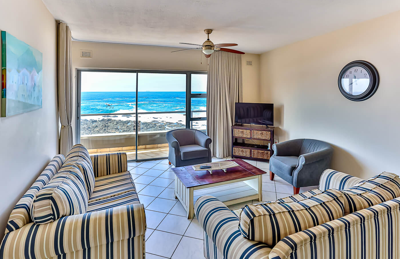 The apartment has three bedrooms and two bathrooms of which both has a bath and overhead shower. The main bedroom, with a queen size bed, leads onto the patio through a sliding door. Both the 2nd and 3rd bedrooms have two single beds each. There are ceiling fans in all the bedrooms, as well as in the lounge area.