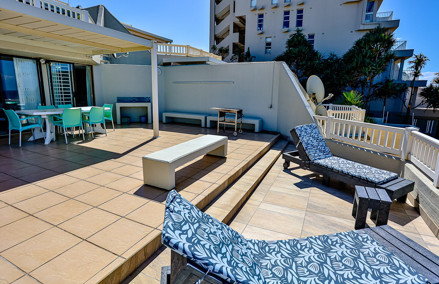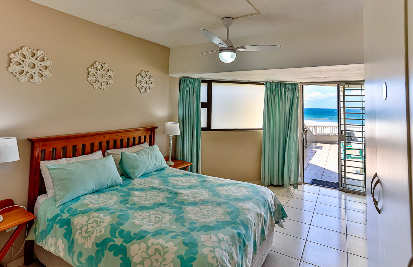 There is a queen size bed in the main bedroom which is en-suite with a bath and hand shower in the bath. The second bedroom has a queen size bed, and third bedroom has two single beds. The guest bathroom has a toilet and a basin. The Third bathroom has a shower and a basin only. All the bedrooms have ceiling fans.