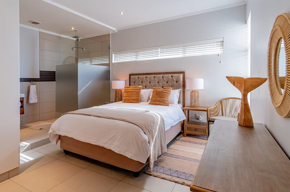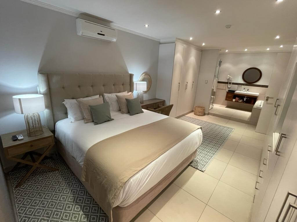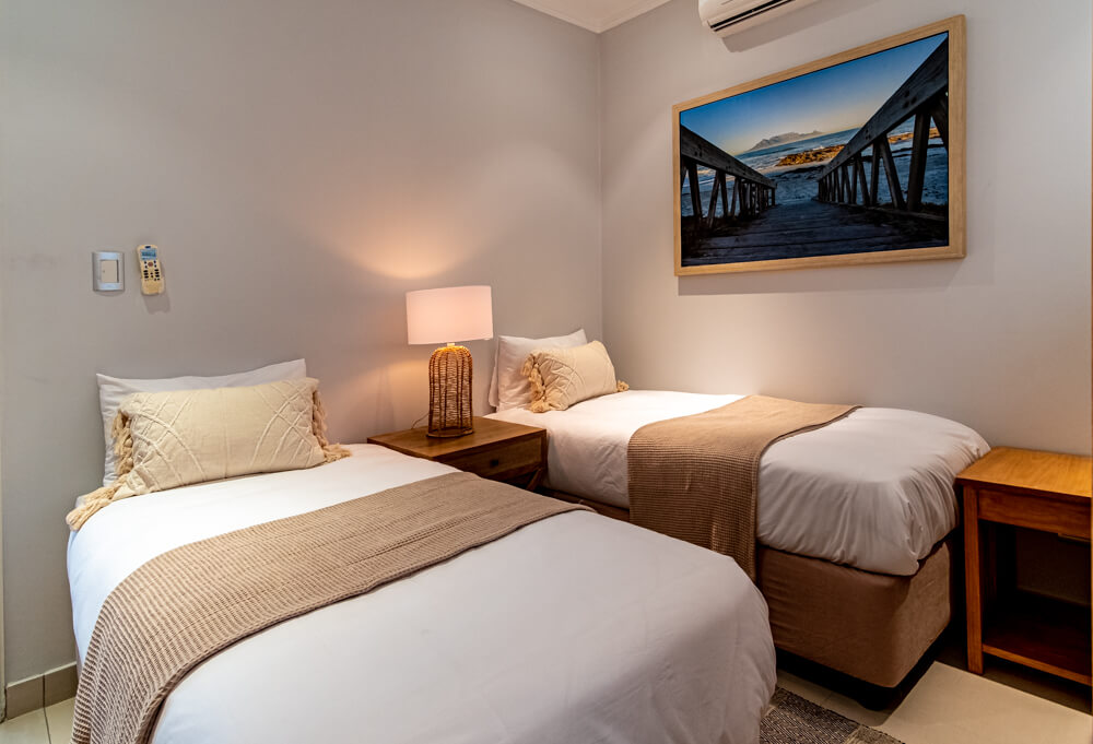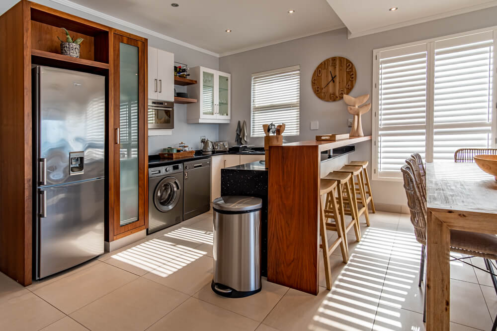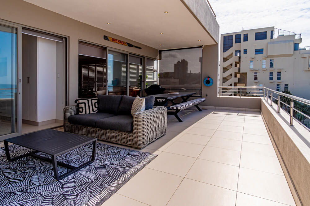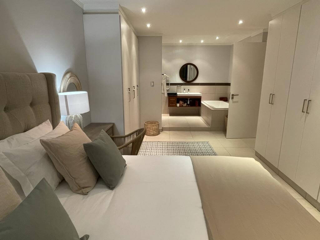 There is air-conditioners in the bedrooms but not in the lounge. The open plan kitchen/dining room/lounge, leads through sliding doors onto the large patio, that is well furnished with modern gas braai and relaxing patio furniture that creates the ultimate outside entertaining experience. The modern kitchen is equipped with a stove, microwave, fridge/freezer, washing machine/tumble dryer combo, dishwasher, toaster, kettle, crockery and cutlery. With a 8 seater dining table inside, and a 8 seater patio table outside there is plenty of space to dine with friends and family. The immaculately furnished lounge and the main bedroom has a smart TV with HP DSTV.There is also free uncapped WiFi and an electronic safe in the unit for your use.