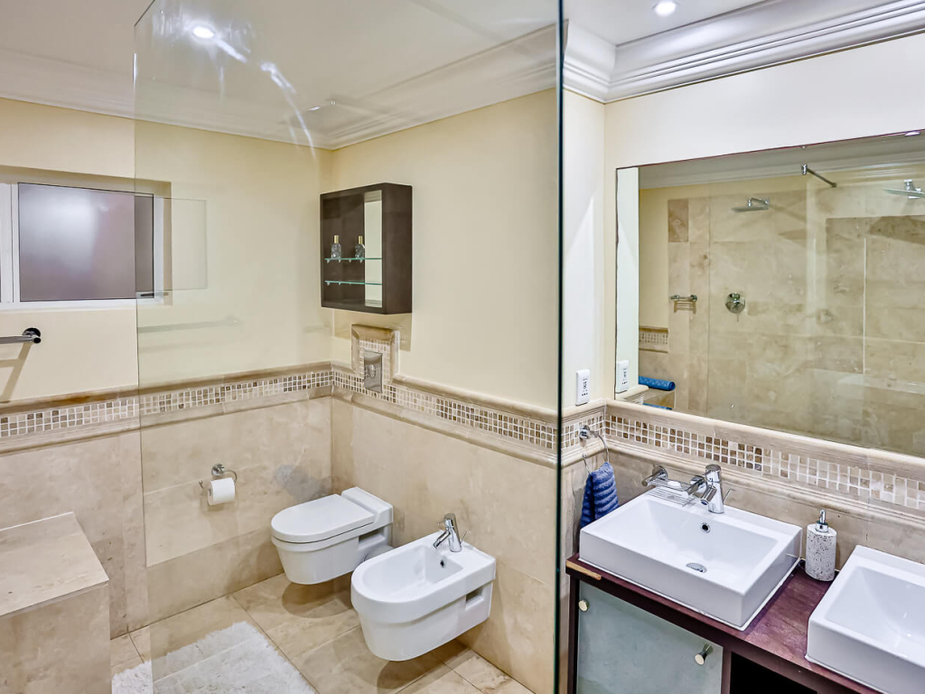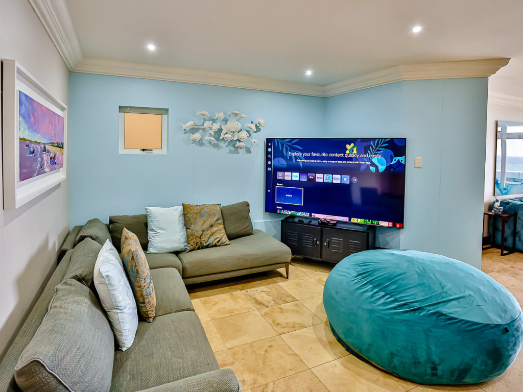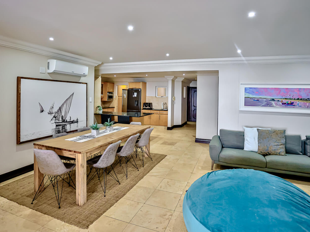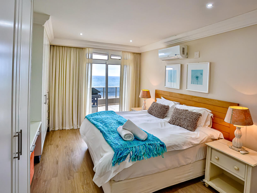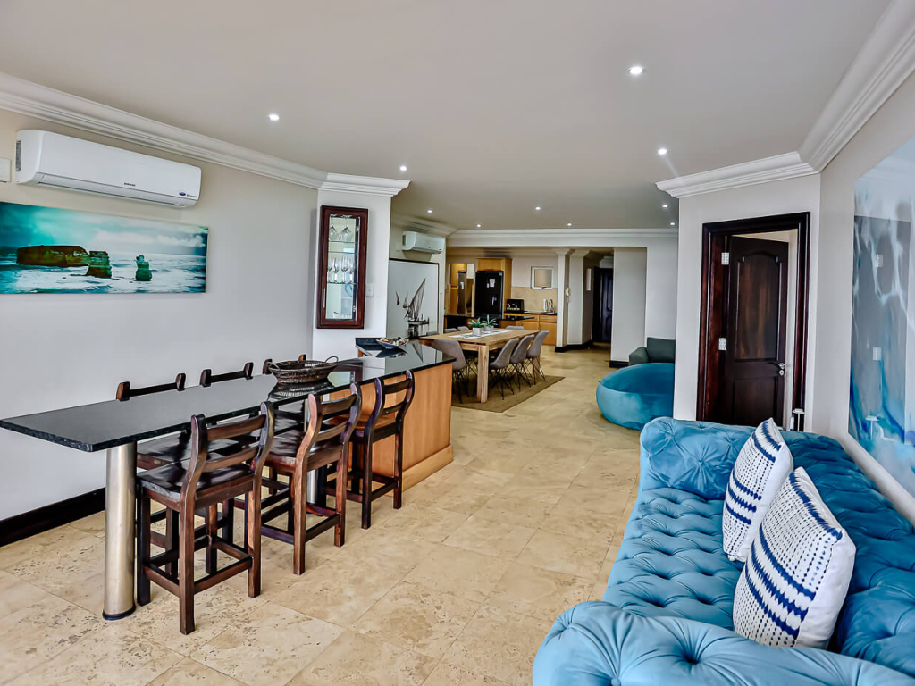 This exclusive, air conditioned, three-bedroom apartment is on the fourth floor of the upmarket complex, Ballito Manor. Access to the unit is through an automated double garage. The unit is situated on the main beach with spectacular beach and sea views from the spacious balcony.
