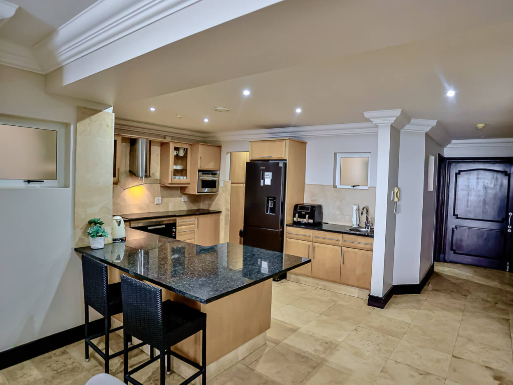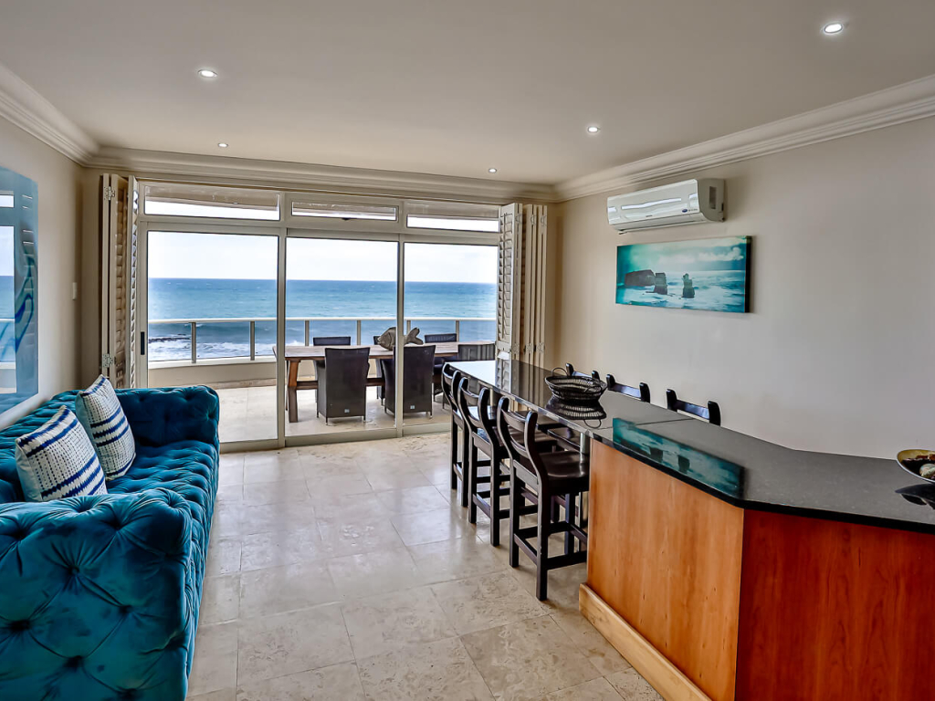 The open plan living area leads through sliding doors onto the furnished balcony with a gas braai. An extended bar counter in the lounge ads to the ambiance.
