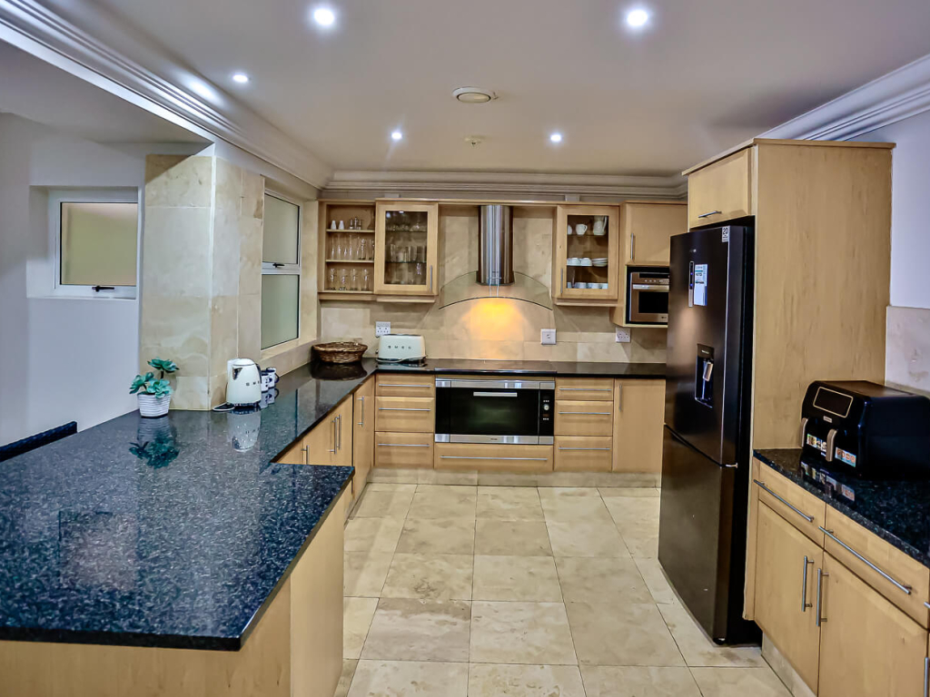 The modern kitchen, with breakfast nook, is equipped with a stove, microwave, fridge/freezer plus another fridge, small chest freezer, washing machine, tumble dryer, dishwasher, toaster, kettle, crockery, and cutlery. In the dining room a 6-seater dining table provides space for elegant entertaining. In the comfortably furnished 2nd lounge, there is a plasma TV and DSTV as well as uncapped Wi-Fi.