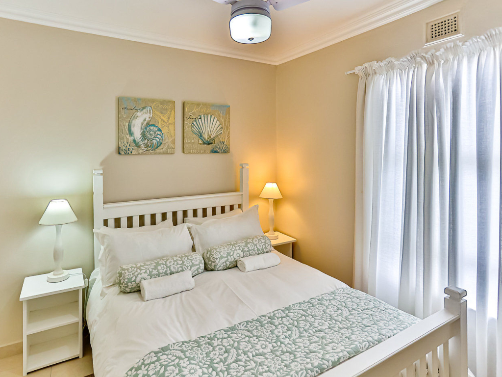The main bedroom with access onto the patio, has a queen size bed and en-suite bathroom with a bath. The 2nd bedroom has a double bed and the 3rd bedroom 2 single beds. All rooms have ceiling fans. A 2nd bathroom services the these 2 bedrooms and has a shower.