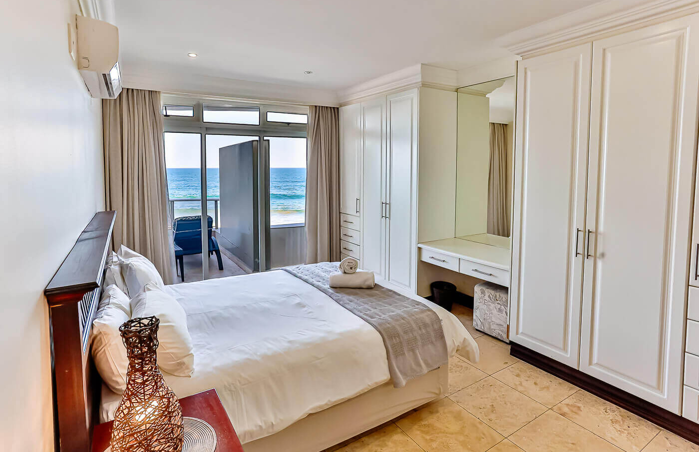 This exclusive, air conditioned, three bedroom apartment is on the fourth floor of the upmarket complex Ballito Manor. Upon access to your unit you drive directly into your double garage. The unit is situated on the main beach with spectacular beach and sea views from the spacious balcony.