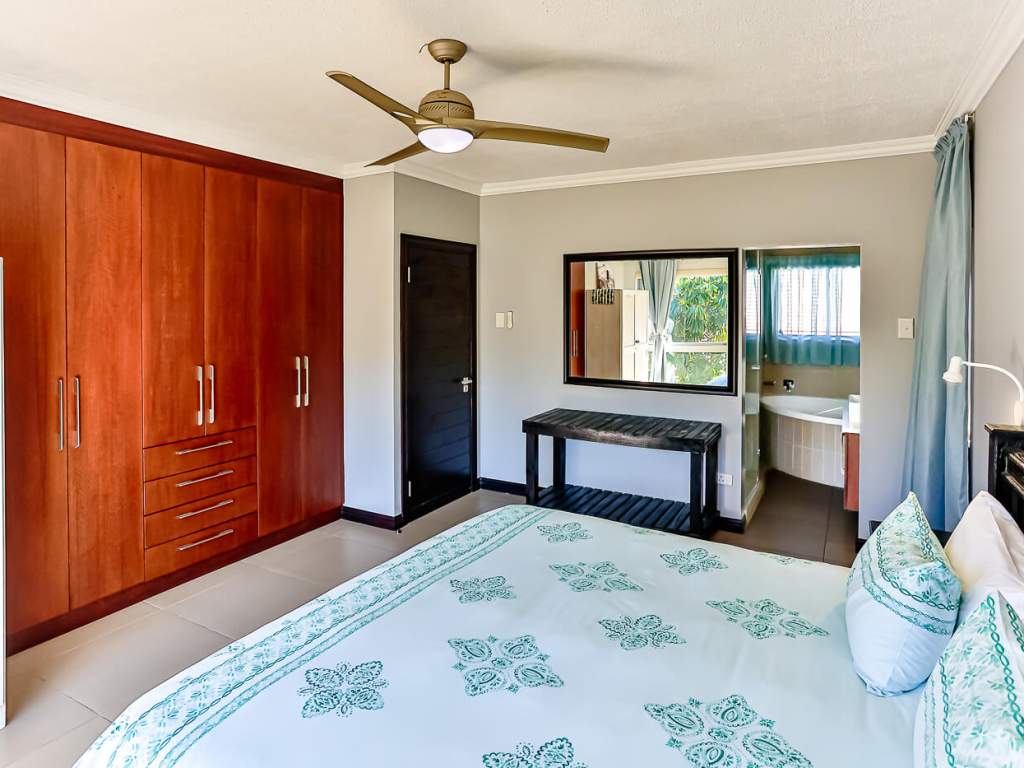 The braai area is situated at the swimming pool in beautifully kept tropical gardens and thatched roof sun covers. There is secure undercover parking for one vehicle. The gate is accessible by remote control only. There are ceiling fans right through the apartment.