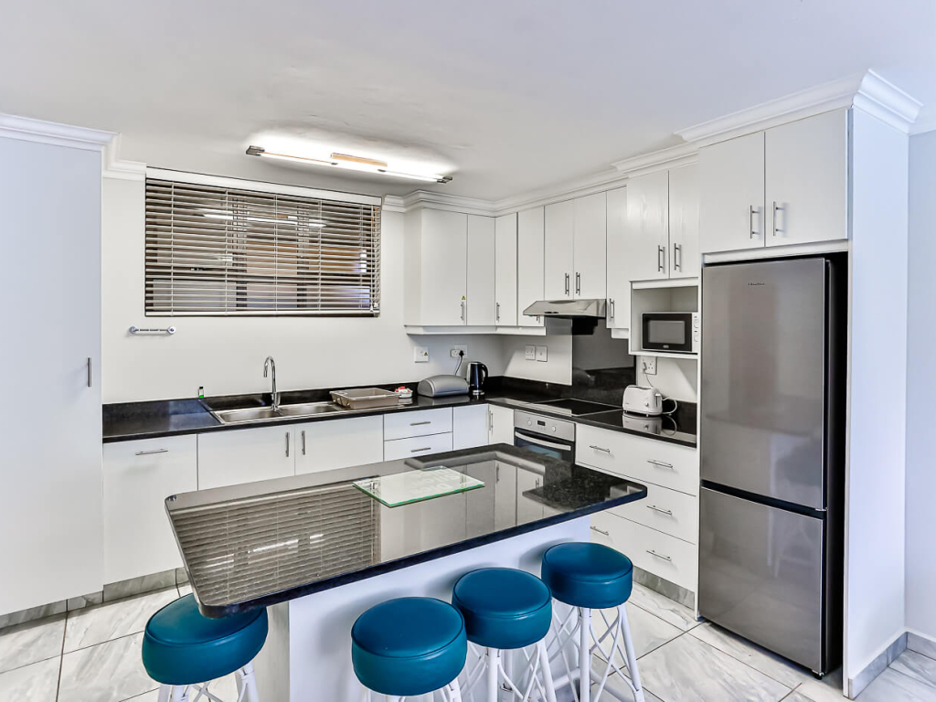 The apartment sleeps two people in a double bed. The bedroom opens up onto the balcony with spectacular beach and sea views. The bathroom has a shower. There are ceiling fans in the bedroom and lounge. The open plan kitchen is equipped with a stove, microwave, fridge/freezer, toaster, kettle, crockery and cutlery. The well furnished living area has a TV with HP DSTV also opens up onto the large balcony.